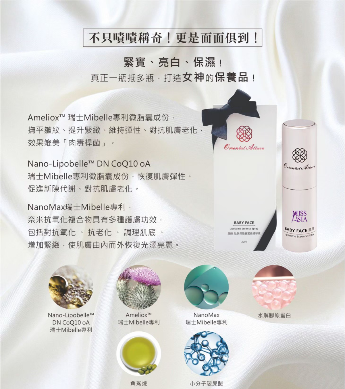Nano-Lipobelle™ DN CoQ10 oA 瑞士 Mibelle 專利、 Ameliox ™瑞士 Mibelle 專利、NanoMax 瑞士 Mibelle 專利 、水解膠原蛋白、角鯊烷、小分子玻尿酸